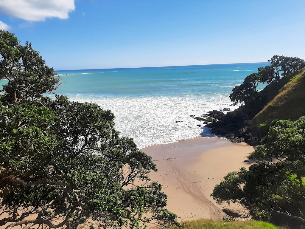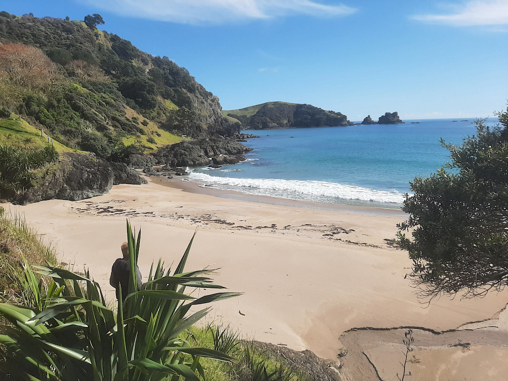 The beach is down a narrow 60m path 19m below the upper level of the bach.