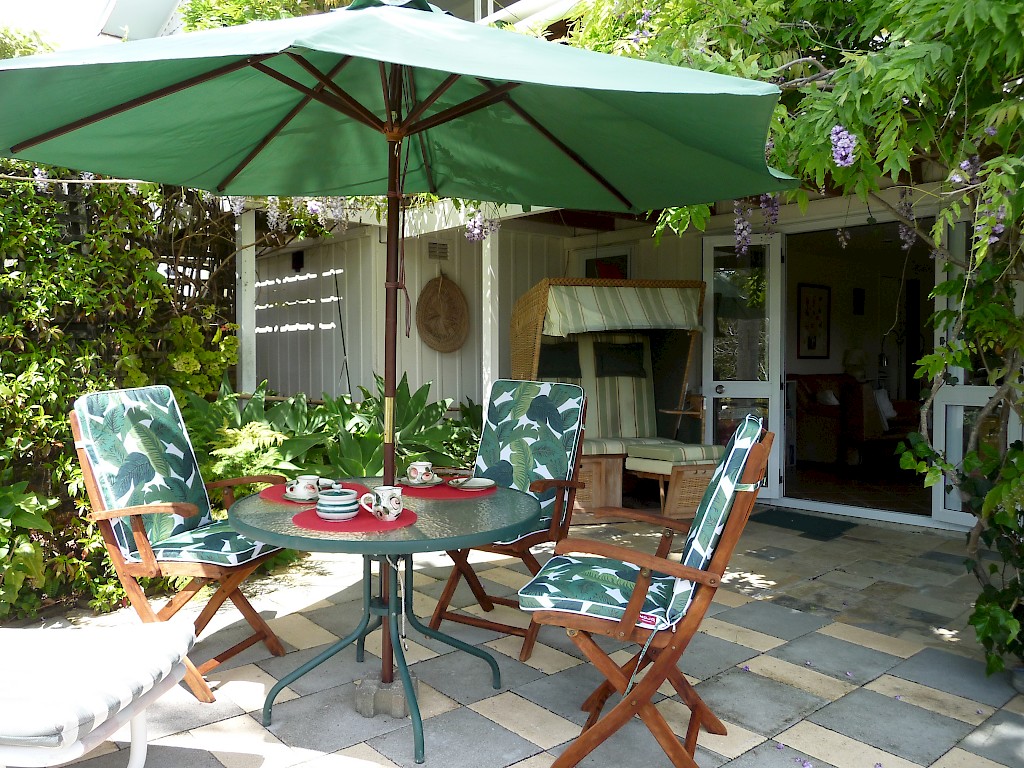 You get only a very small glimpse to the Bay from here but the Studio is surrounded by a subtropical garden, very quiet and relaxing. A sheltered private Patio to enjoy all day sun, outdoor furniture, BBQ and Strandkorb ( beach basket)