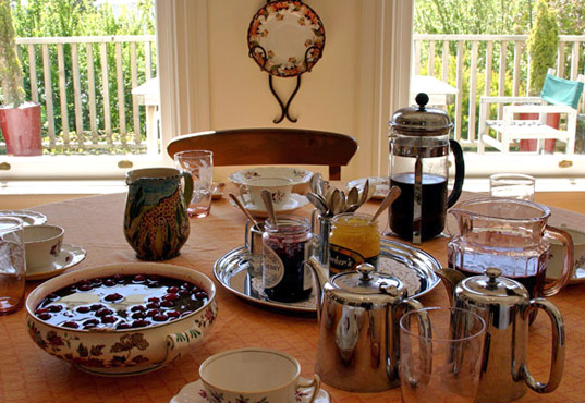 Enjoy a full cooked breakfast: fresh fruit salad, boysenberry compote, homemade granola, yoghurt, Vogel’s toast, English muffins and bacon and eggs – at the round table in the dining room with other guests.